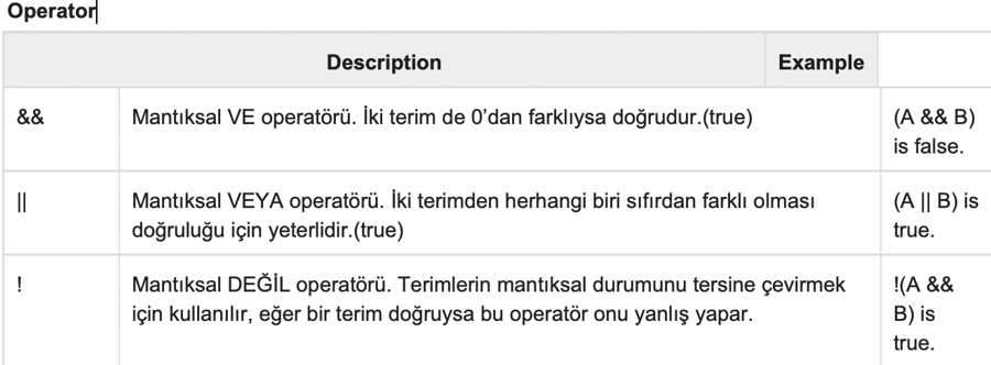 Aşağıdaki tablo C dili tarafından desteklenen tüm mantıksal operatörleri gösterir. A değişkeni 1, B değişkeni de 0 değerini tutarsa -![]()