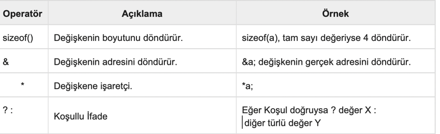 Yukarıda tartışılan operatörlerin yanı sıra, sizeof ve? : C Dili tarafından desteklenir.![]()