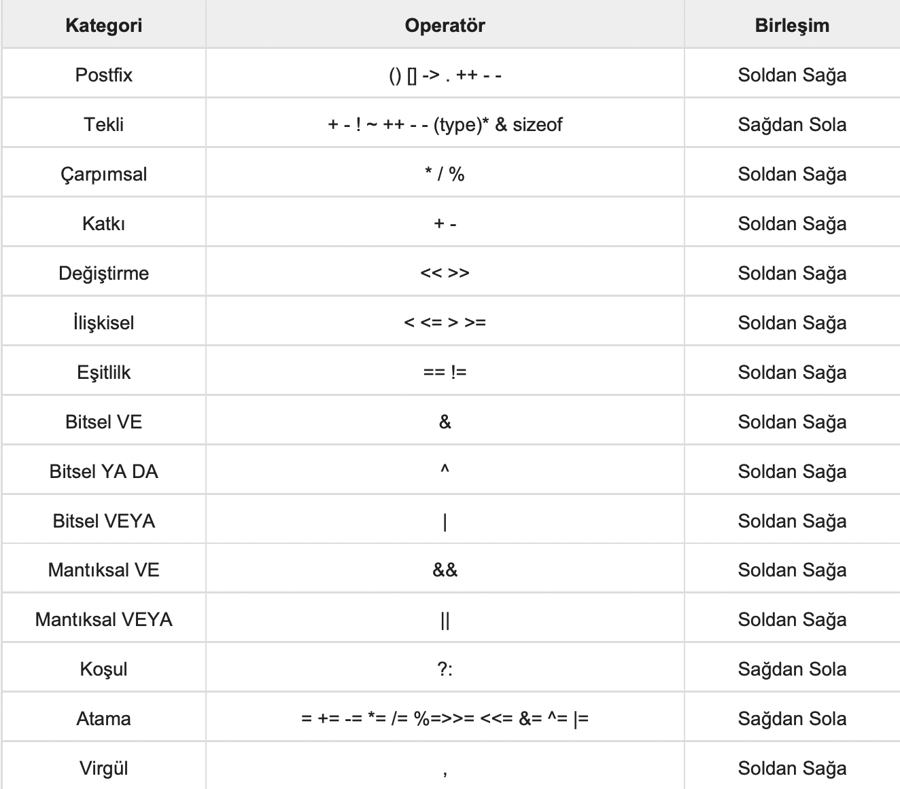 Burada, en yüksek önceliğe sahip operatörler tablonun en üstünde, en düşük seviyeli olanlar ise en altta belirtilmiştir. Bir ifade içerisinde önce yüksek öncelikli operatörler değerlendirilecektir.