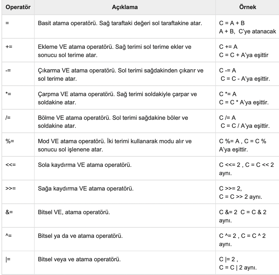 Aşağıdaki tablo C dili tarafından desteklenen tüm atama operatörlerini gösterir. -