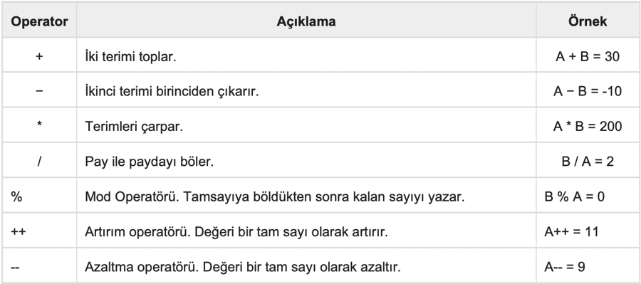 Aritmetik Operatörler