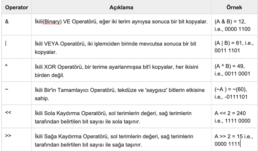 Aşağıdaki tablo C dili tarafından desteklenen tüm bitsel operatörleri gösterir. A değişkeni 60 ve B değişkeni 13’ü tutarsa -![]()