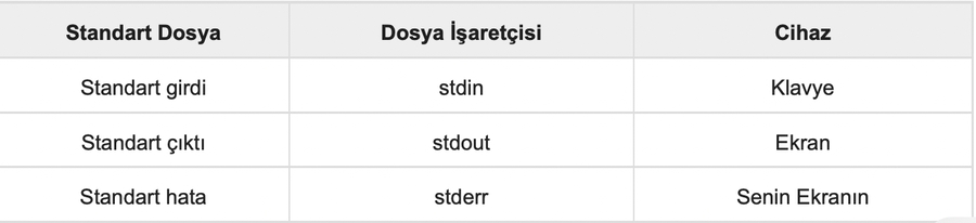 C programlama tüm cihazlara dosyalar olarak davranır. Böylece ekran gibi cihazlar dosyalarla aynı şekilde ele alınır ve bir program yürütüldüğünde, klavyeye ve ekrana erişim sağlamak için aşağıdaki üç dosya otomatik olarak açılır.![]()