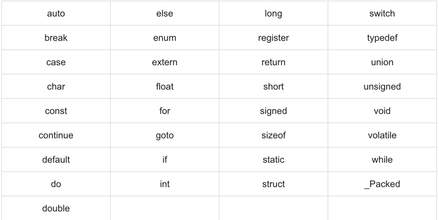 Aşağıdaki liste, C’deki ayrılmış kelimeleri gösterir. Bu ayrılmış kelimeler, sabitler veya değişkenler veya diğer tanımlayıcı isimler olarak kullanılamaz.![]()